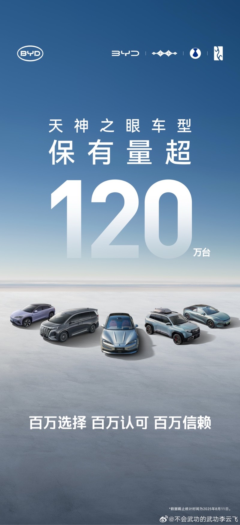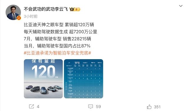 【TechWeb】8月13日消息,比亚迪集团品牌及公关处总经理李云飞宣布,截至2025年7月底,比亚迪天神之眼车型累计销量突破120万辆,每天辅助驾驶数据生成超7200万公里。