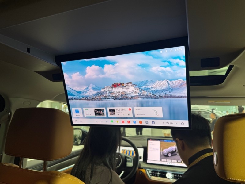 后排增加了一块17.3英寸吸顶屏幕,具备3K分辨率,支持手势、语音、触控、手机、遥控以及后排扶手屏等多种控制方式。