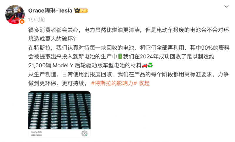 8月10日消息,特斯拉副总裁陶琳今日在微博发文,对特斯拉电池回收做出回应。