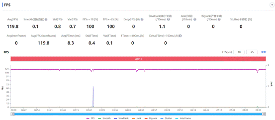 在《王者荣耀》中,iQOO Z10 Turbo+的表现非常出色。开启超高画质和超高帧率模式后,游戏过程中的帧率全程稳如一条直线,平均帧率119.8 FPS,帧率波动极小,多人团战也感受不到丝毫卡顿。配合144Hz高刷屏和3000Hz触控采样率,操作丝滑跟手。