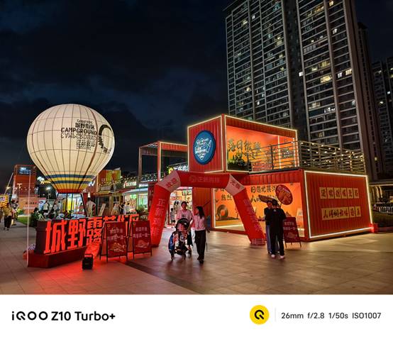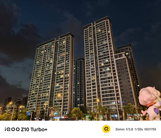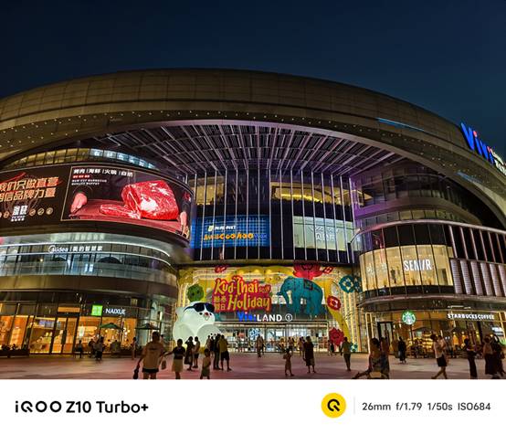 在夜景拍摄方面,iQOO Z10 Turbo+凭借旗舰同款NICE 2.0影像算法和大底光学防抖主摄,夜景表现超出预期。画面纯净度不错,噪点控制良好。高光压制比较到位,灯牌文字清晰可见,暗部细节也有一定保留。虽然和顶级影像旗舰的夜视仪效果有差距,但在性能向手机中绝对属于优秀水平。