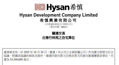 10月27日消息,港股上市公司希慎兴业10月24日发布公告称,当日全资子公司广运作为卖方与买方订立协议,根据该协议的条款及条件,广运同意向买方出售位于竹林苑的一个住宅单位(实用面积约为2084平方呎,约合193平方米),价格为5354万港元。